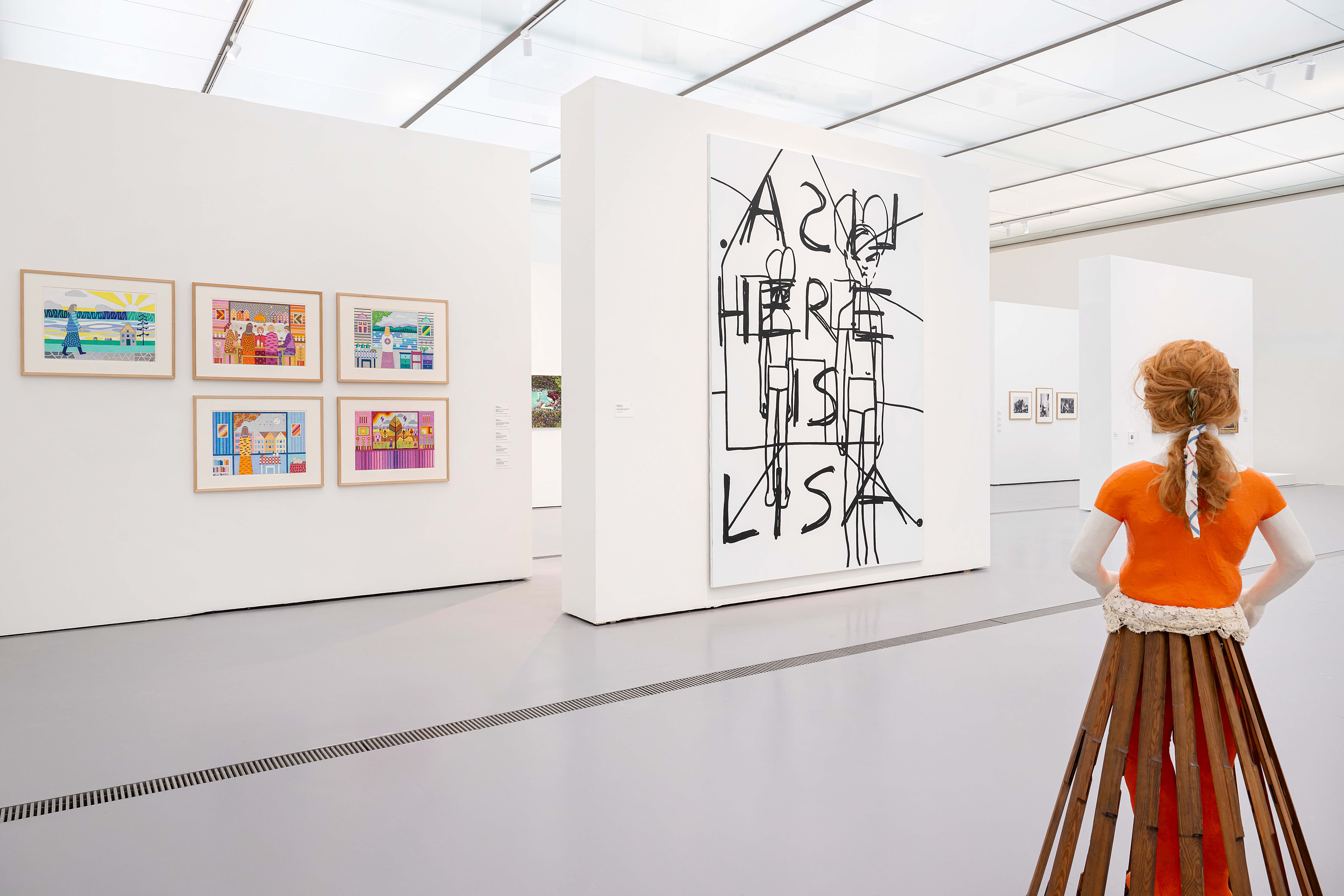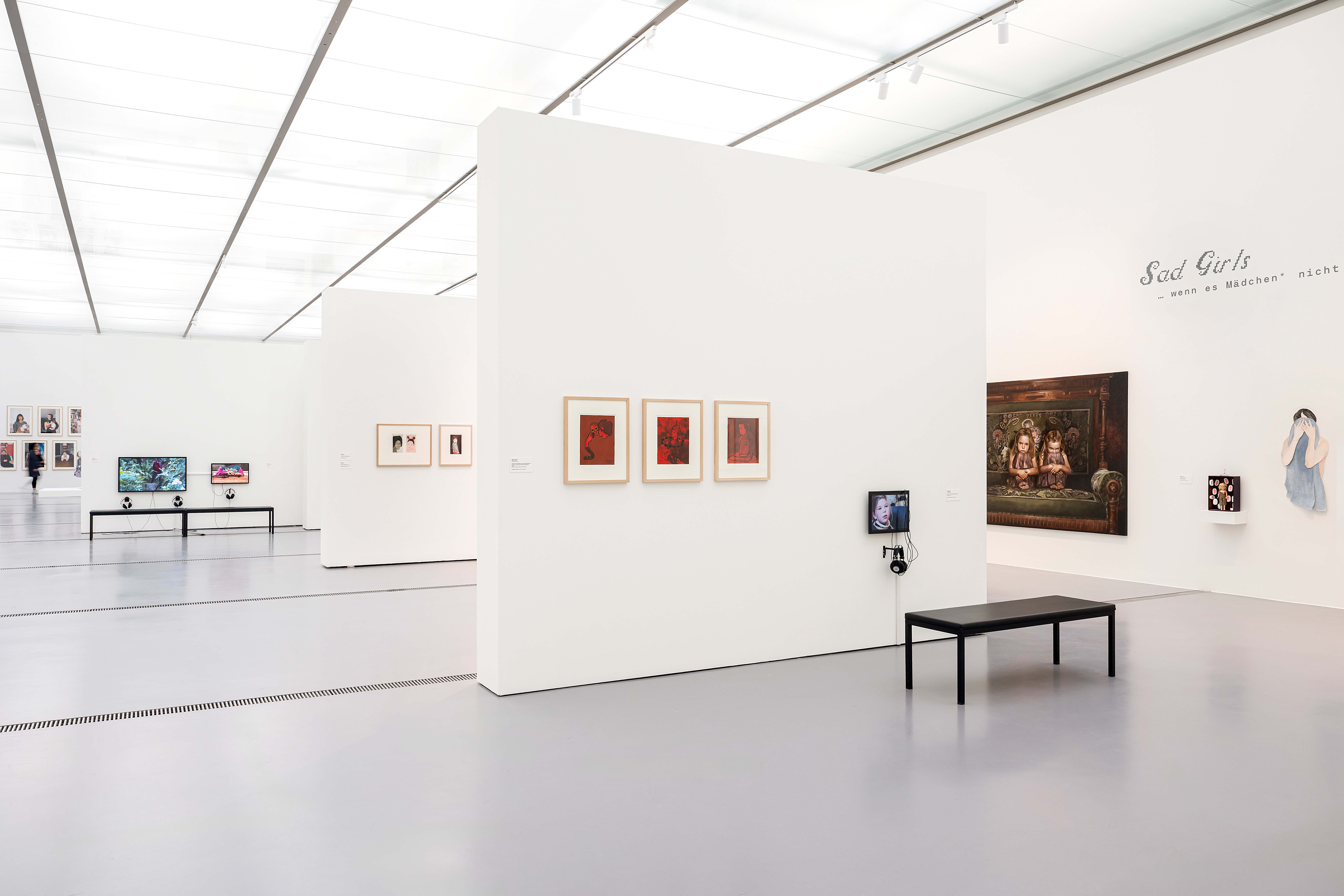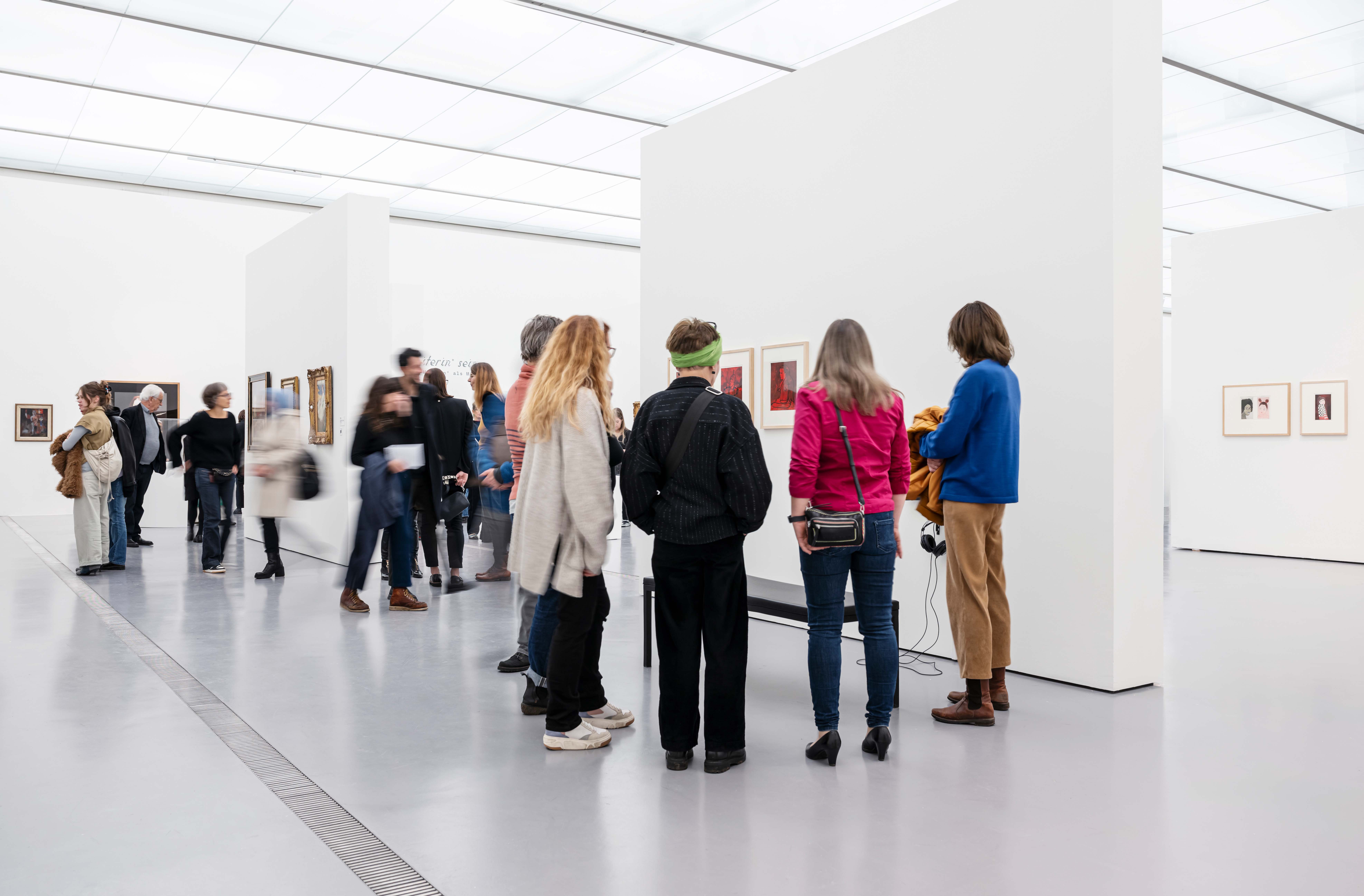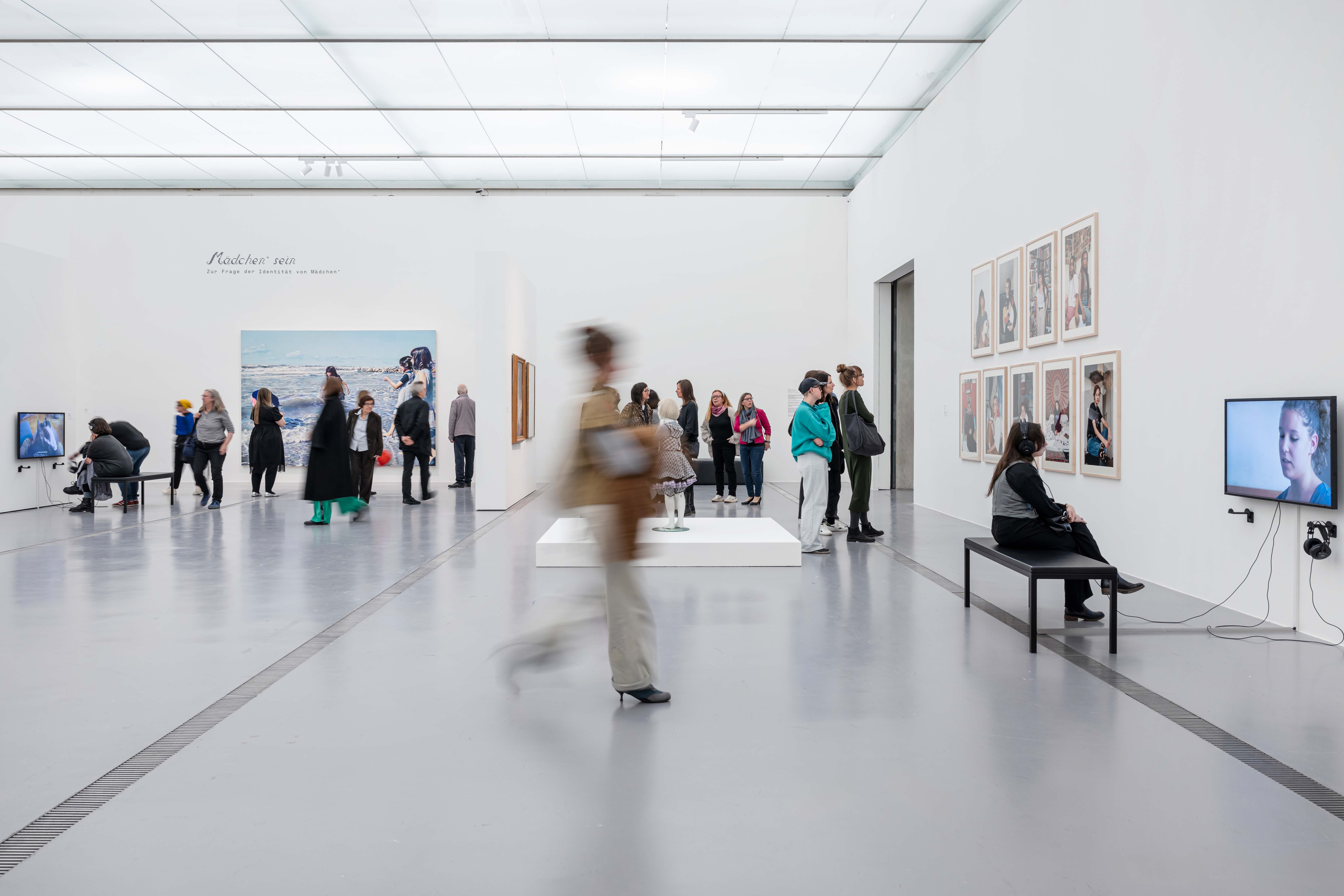 For the exhibition, an architectural concept was developed that provides ample space for more than 150 exhibits while clearly conveying the thematic structure of the curatorial concept. Free-standing, uniformly dimensioned wall elements organize the content into a permeable, open arrangement of individual chapters and at the same time preserve the full spatial impact of the museum’s large hall. Through the precisely positioned walls, shifted in parallel to one another, visitors experience a gently unfolding spatial dramaturgy as they move through the exhibition, marked by changing sightlines and thus by varying correspondences between the artworks. Particular attention was given to the education and mediation area. An intimate room-within-a-room zone for relaxing, combined with mobile work furniture, consoles, and wall rails at varying heights, allows young people to actively use, appropriate, and shape “The Room” throughout the entire duration of the exhibition. The large-scale facade graphics ensure strong visual presence of the exhibition in the surrounding public space.The furnishings were conceived with sustainability in mind: the wall cubes are custom-designed to meet the museum’s needs and will be stored for reuse after the exhibition ends.
