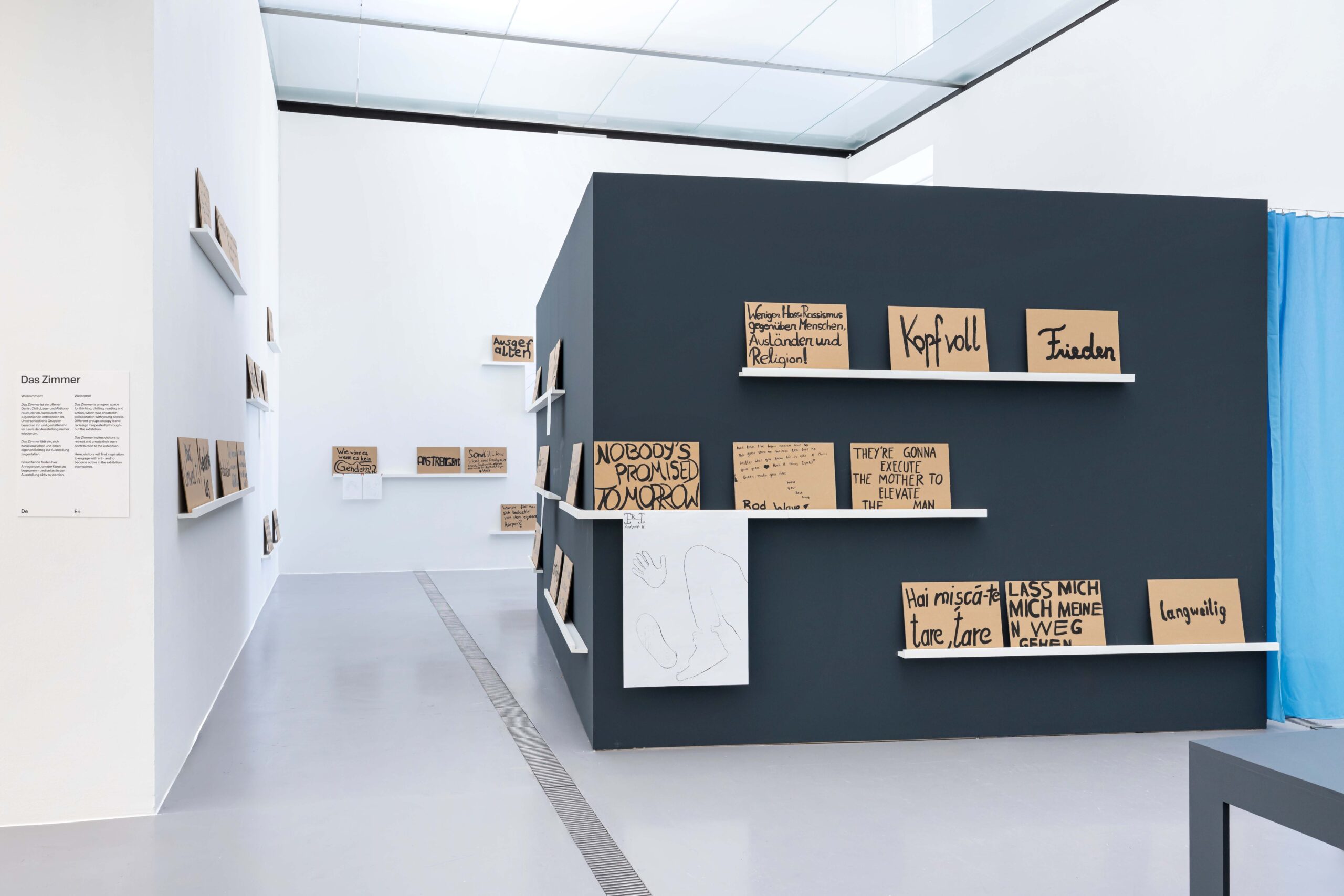 Für die Ausstellung wurde eine Architektur entwickelt, die ausreichend Raum für die über 150 Exponate bietet und zugleich das inhaltlich-kuratorische Konzept nachvollziehbar macht. Freistehende, einheitlich groß dimensionierte Wandelemente ordnen die einzelnen Themenbereiche zu einem durchlässigen, offenen Gefüge und bewahren dabei die volle räumliche Wirkung des großen Museumssaals. Durch die präzise gesetzten, zueinander parallel verschobenen Wände erleben die Besucher:innen beim Durchwandern der Ausstellung eine sanft bewegte Dramaturgie aus wechselnden Blickachsen, wodurch sich unterschiedliche Korrespondenzen zwischen den Kunstwerken ergeben. Besonderes Augenmerk galt dem Vermittlungsbereich: Mit einer intimen Raum-in-Raum-Zone zum Chillen, beweglichen Arbeitsmöbeln, Konsolen und Wandleisten in verschiedenden Höhen kann „Das Zimmer“ während der gesamten Ausstellungsdauer von Jugendlichen aktiv bespielt und gestaltet werden. Die großflächige Fassadenbeklebung sorgt für visuelle Präsenz der Ausstellung im Außenraum. Die Ausstattung ist nachhaltig konzipiert: Die Wandkuben sind maßgeschneidert für den Bedarf des Museums und werden nach Ende der Ausstellung zur Wiederverwendung eingelagert.
